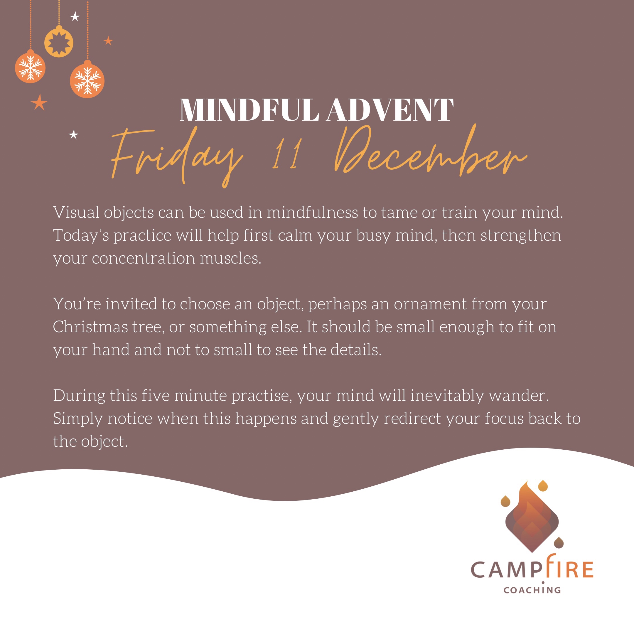 During this five minute practise, your mind will inevitably wander. Simply notice when this happens and gently redirect your focus back to the object.