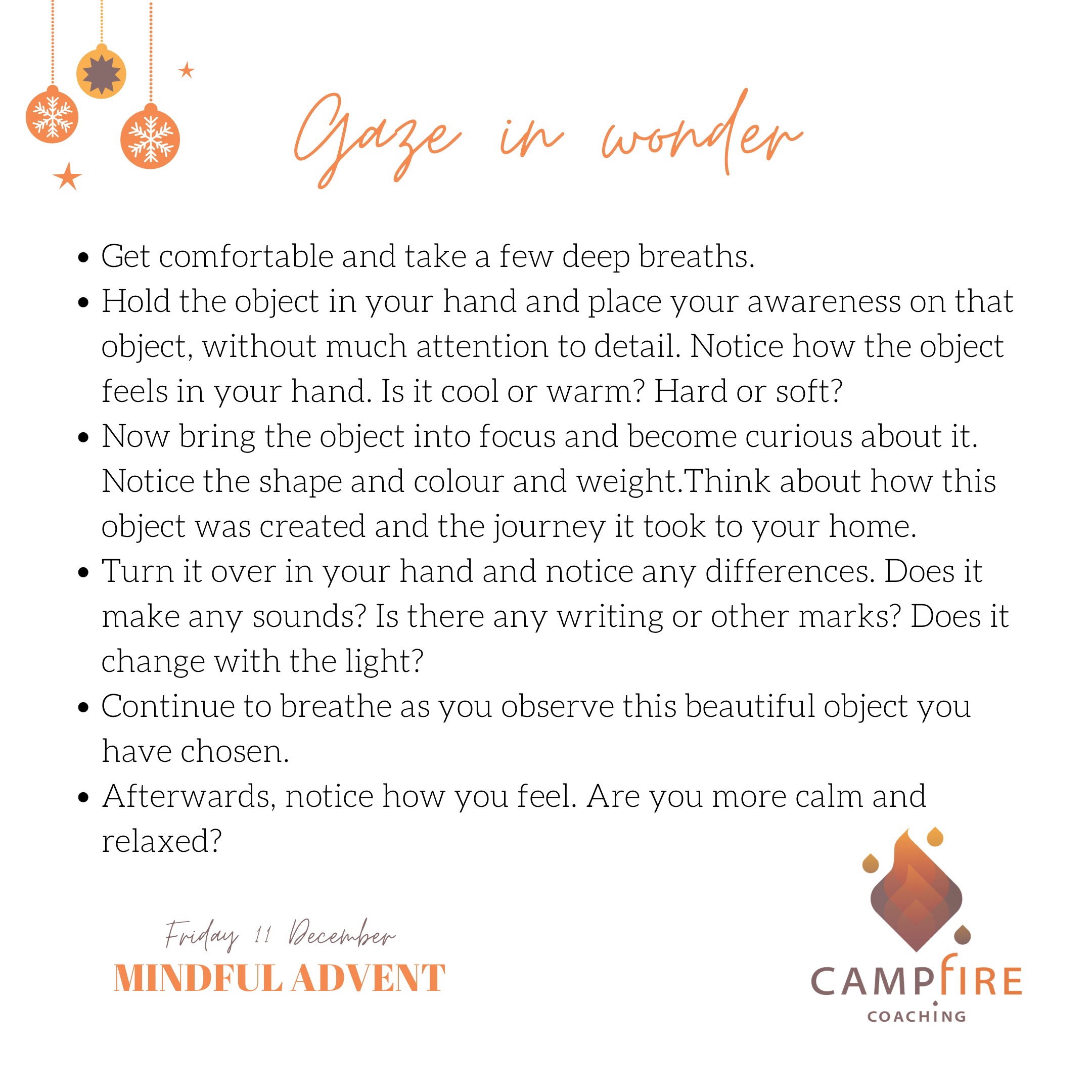 You’re invited to choose an object, perhaps an ornament from your Christmas tree, or something else. It should be small enough to fit in your hand and not too small to see the details.