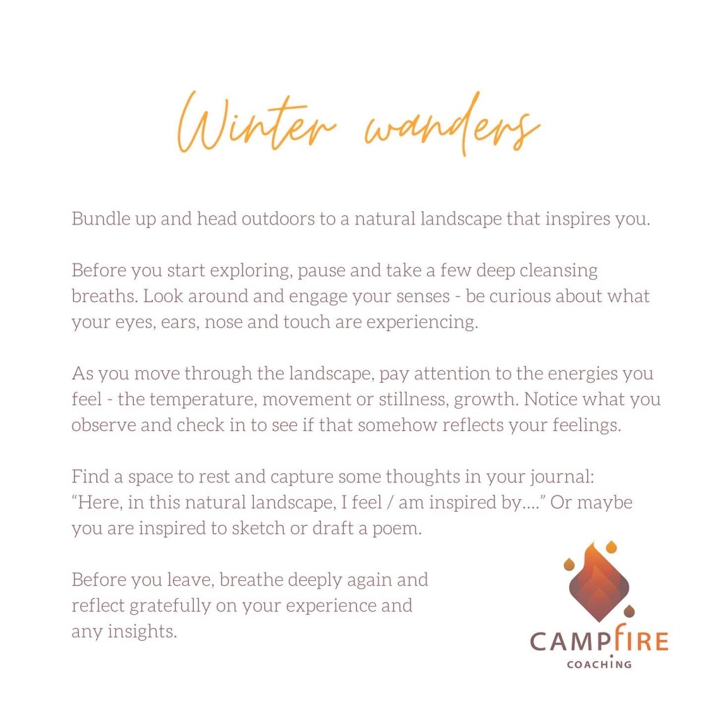 Move through the landscape, paying attention to the energies you feel – perhaps the temperature, movement or stillness, growth or rest. Notice what you observe and check in to see if that somehow reflects how you are feeling today.