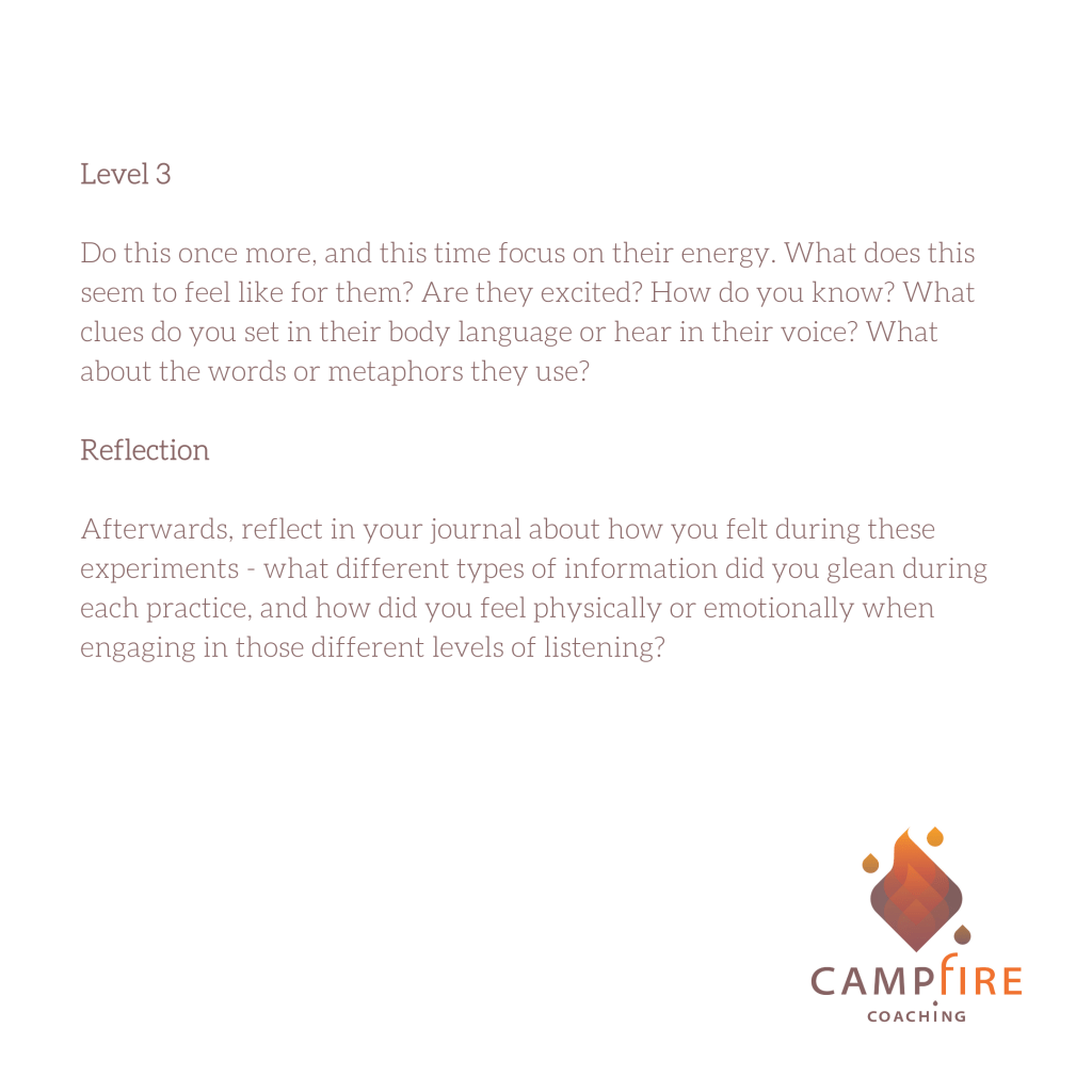 Do this once more, and this time focus on their energy. What does this seem to feel like for them? Are they excited? How do you know? What clues do you set in their body language or hear in their voice? What about the words or metaphors they use?